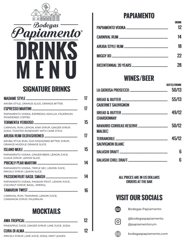Discover Aruba’s boldest spirits – from smooth sips to creative cocktails. Our menu highlights the versatility of our rums and vodkas, along with a few surprise favorites.